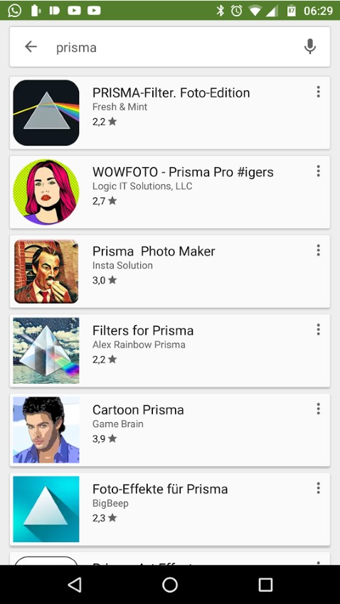 Und da sind wir auch schon bei einem Problem: wer im Play Store nach „prisma“ sucht, wird hunderte Apps angezeigt bekommen, die ‚Prisma‘ oder ‚Foto for Prisma‘ oder ‚Prisma Editor‘ oder so ähnlich heißen – die allesamt (das kann man ruhig so nennen) scams sind. Die Apps versprechen ebenfalls tolle Filter und wasweißichnichtalles, ballern euch aber mit Vollbildwerbung zum zwingen euch teilweise Werbe-Videoclips zu schauen oder leiten euch auf dubiose Seiten weiter, wenn ihr nur das neue Selfie pimpen wollt. Das App-Icon, bzw. Logo sieht bei den meisten zum Verwechseln ähnlich
